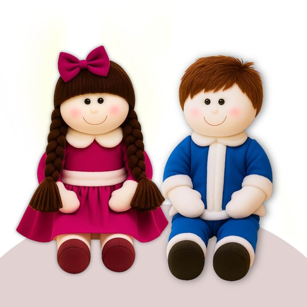 Com este kit de moldes você cria duas versões da mesma boneca de pano: (menina e menino), além de roupas e um gorro natalino super charmoso. Veja o que está incluso: